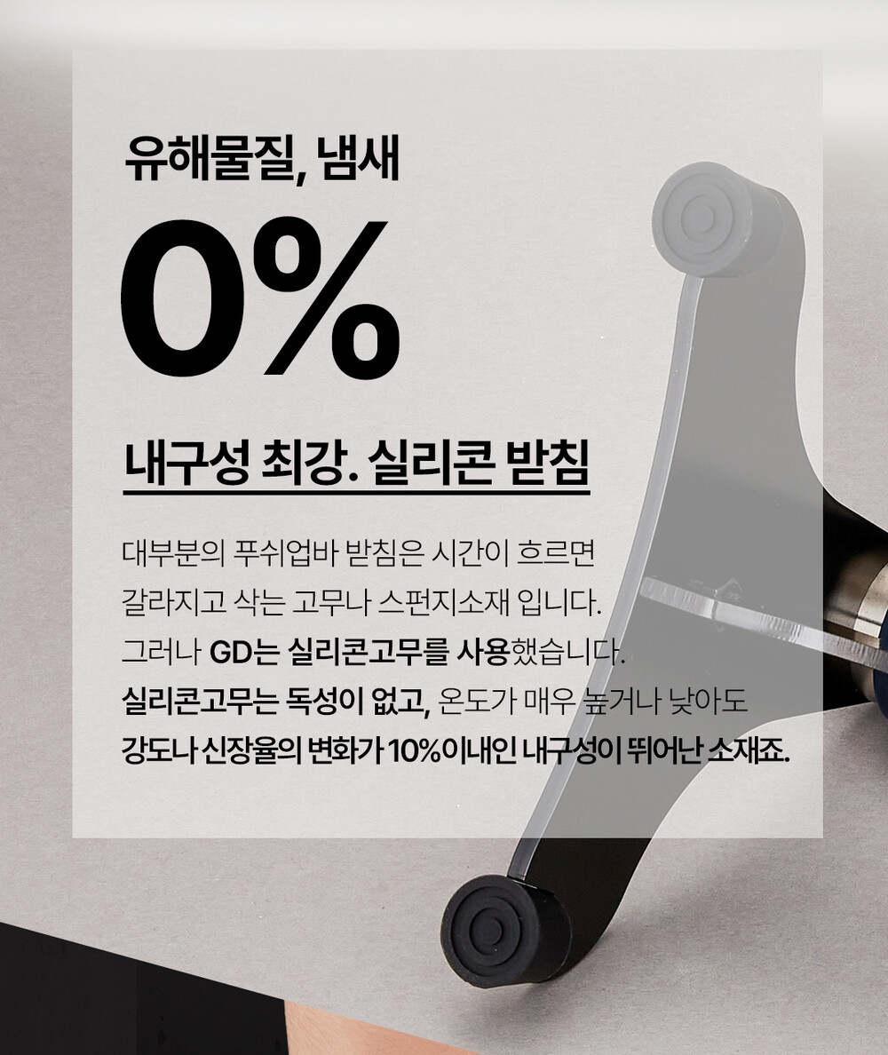 4개의 실리콘 받침은 푸쉬업 운동 시 몸이 흔들리지 않도록 지지해줍니다. 저가형 고무나 스펀지 손잡이가 아닌 고급 실리콘 손잡이가 손이 아프지 않도록 보호 해주고, 푸쉬업바에서 손이 미끄러지지 않도록 도와줍니다.