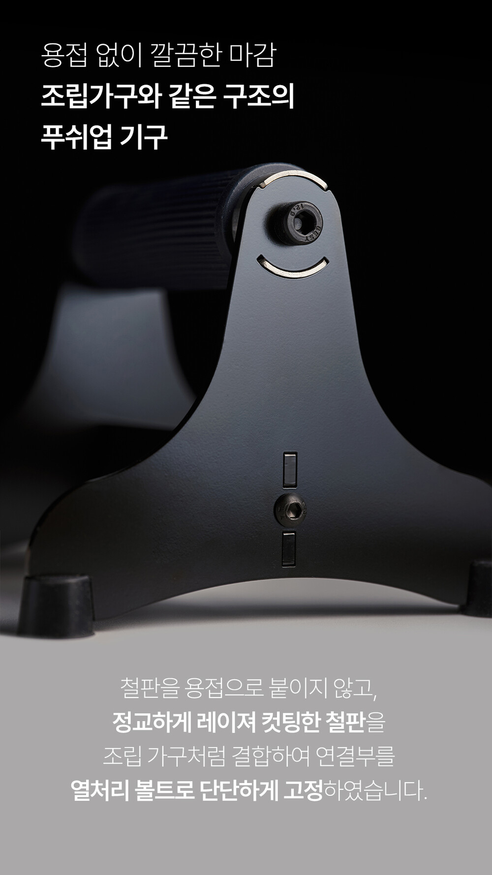철 파이프를 용접하여 만든 타사 푸쉬업바와는 달리, GD 익스푸시는 강철판을 조립식으로 결합하여 만들어 세상 어떤 푸쉬업바보다 견고하고 튼튼합니다.